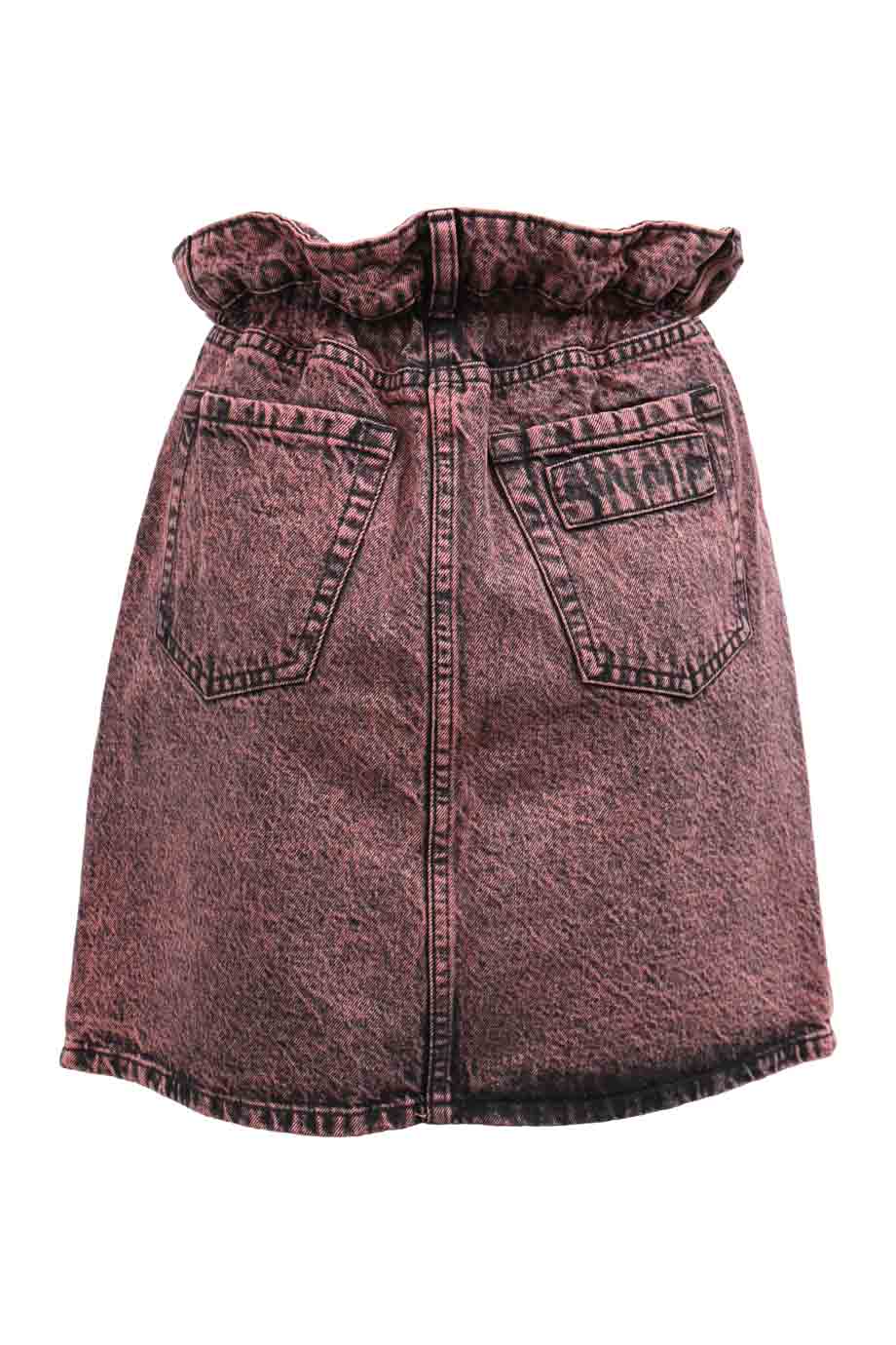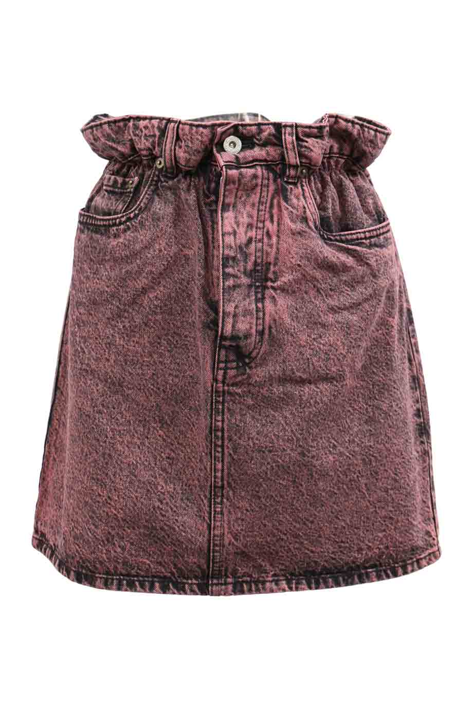 Red acid-wash cotton denim mini skirt featuring elasticated paperbag waist