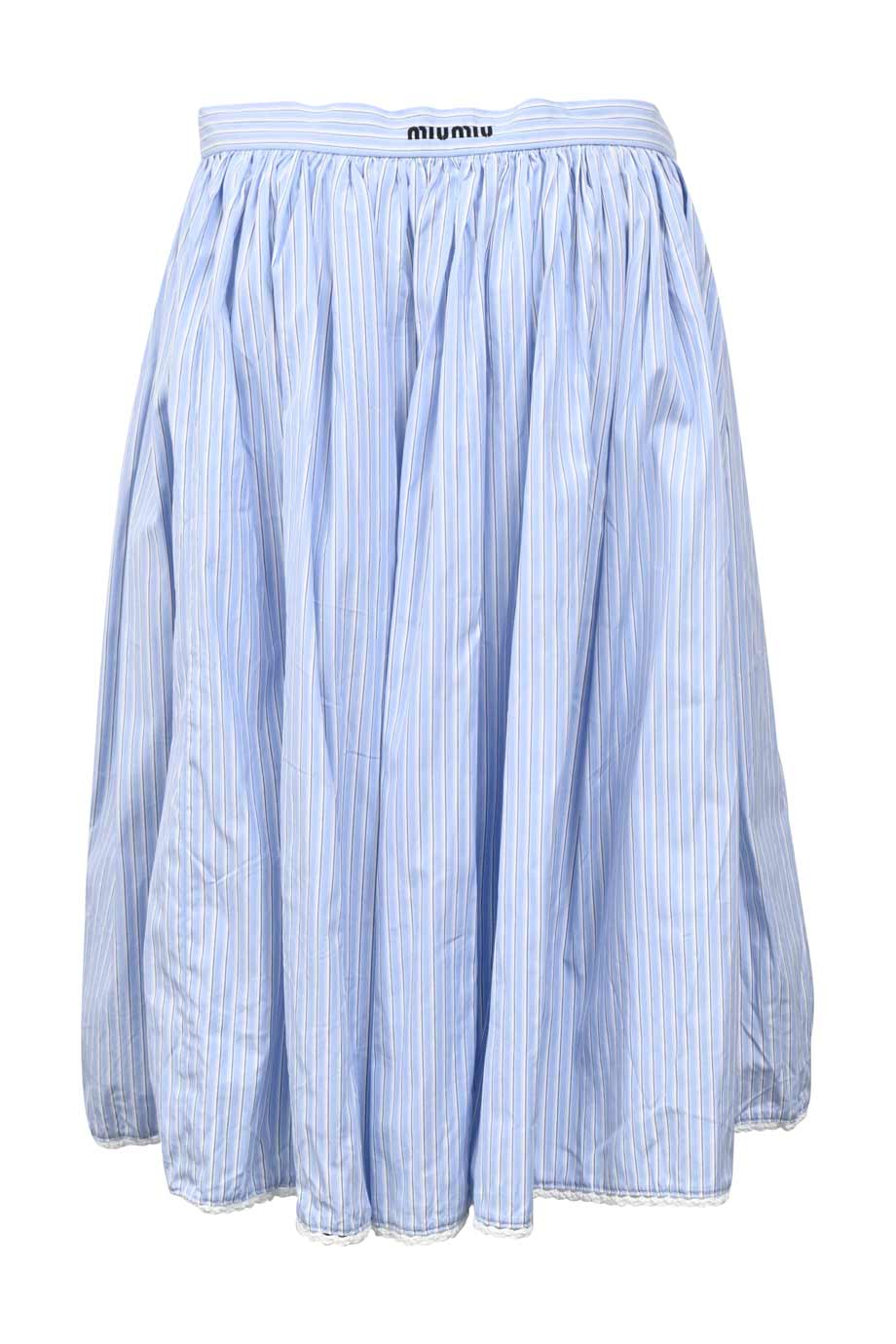 Baby blue and white silk high-waisted floral print midi skirt with asymmetrical hem