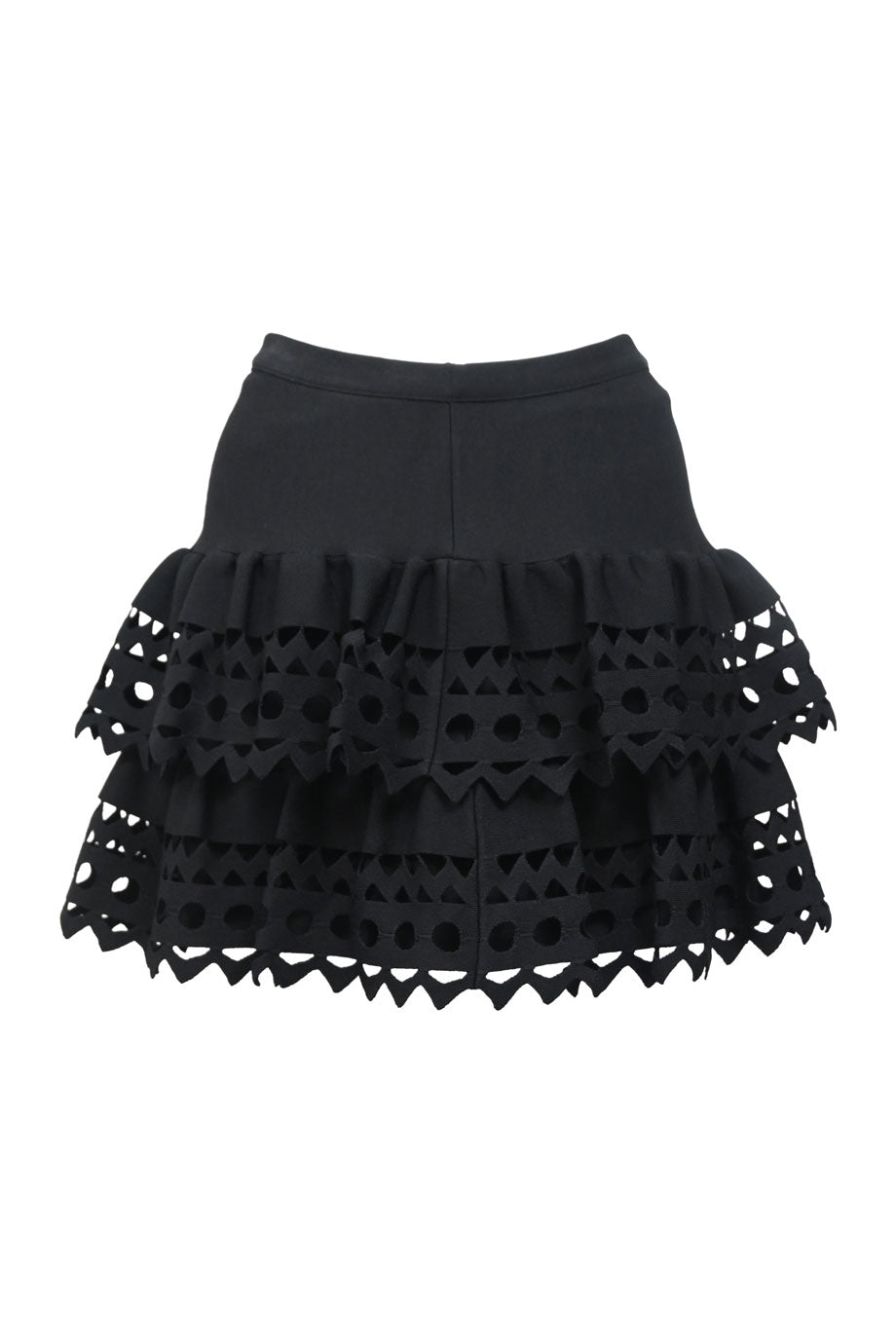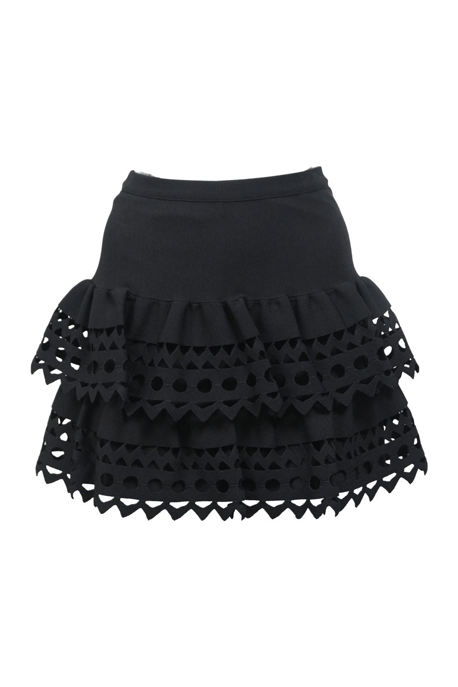 Black polyamide-blend cascade ruffle tier flounce mini skirt