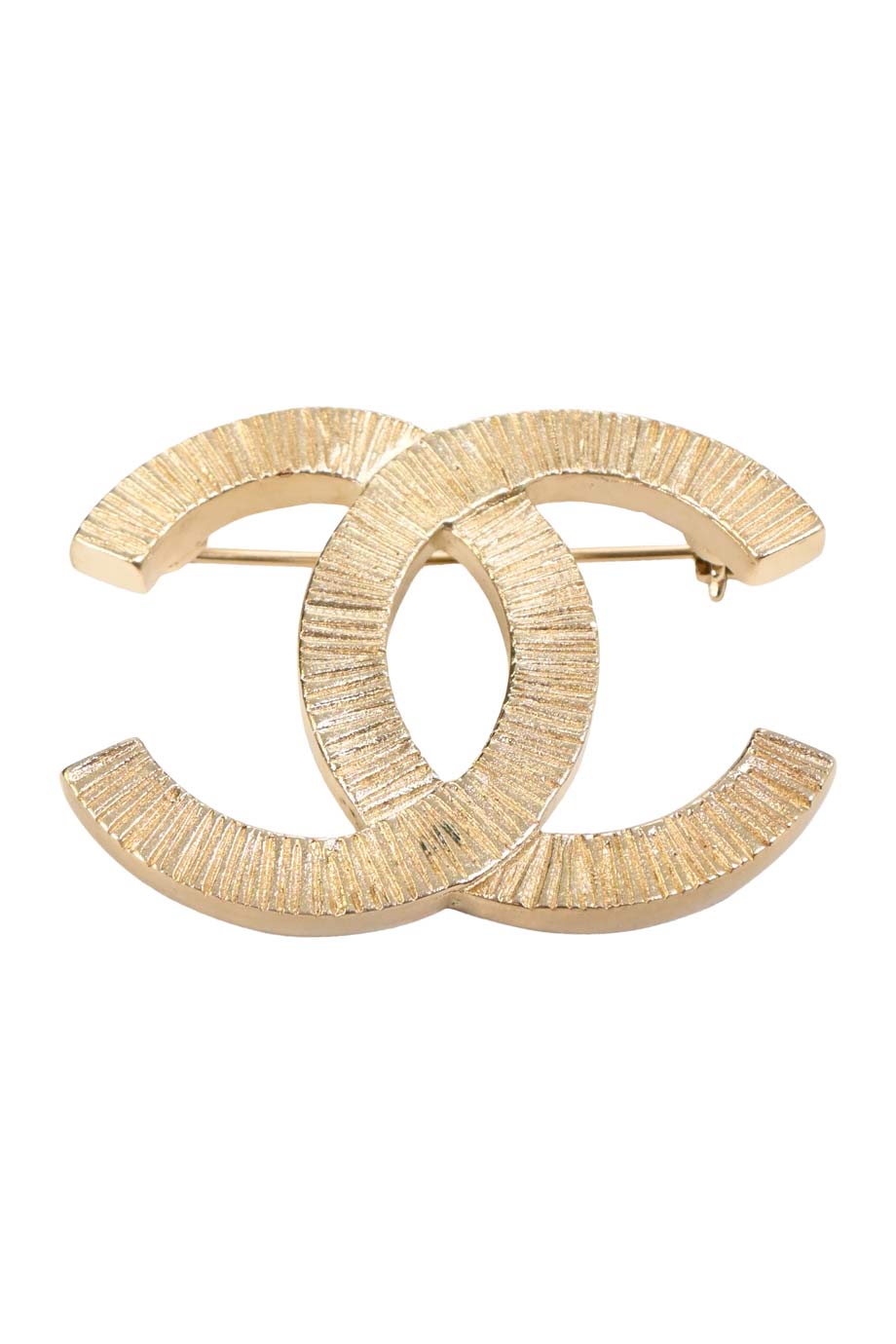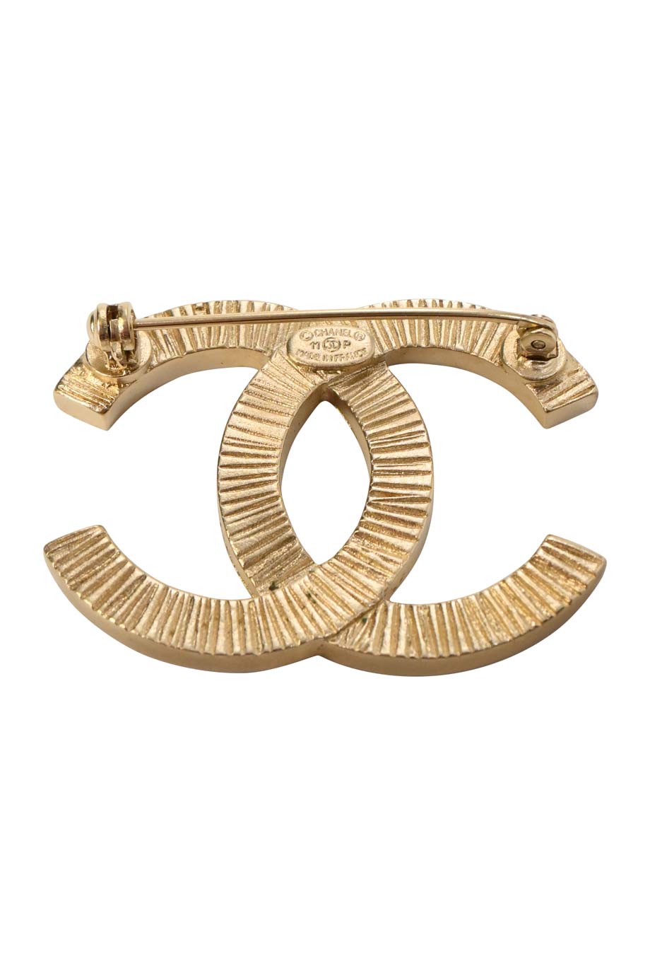 Black crystal-embellished camellia brooch featuring Coco Mark plaque appliqué