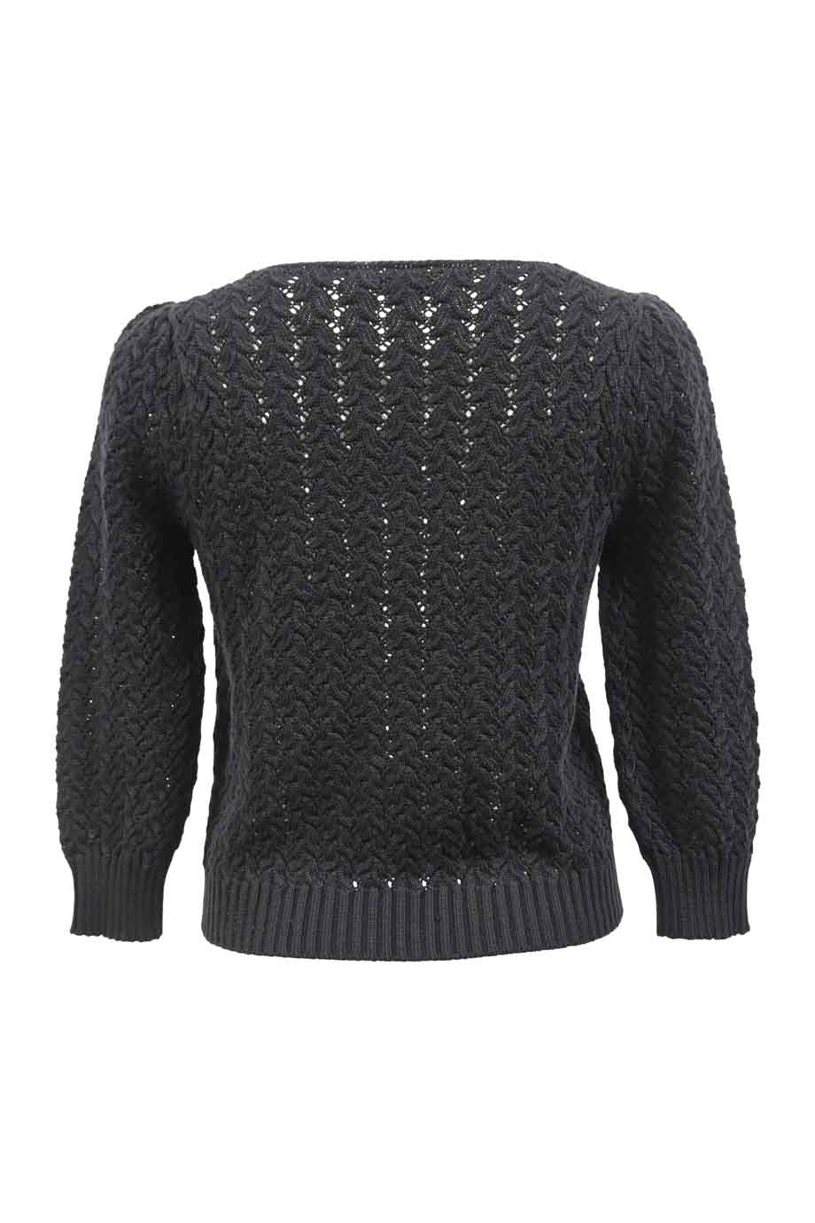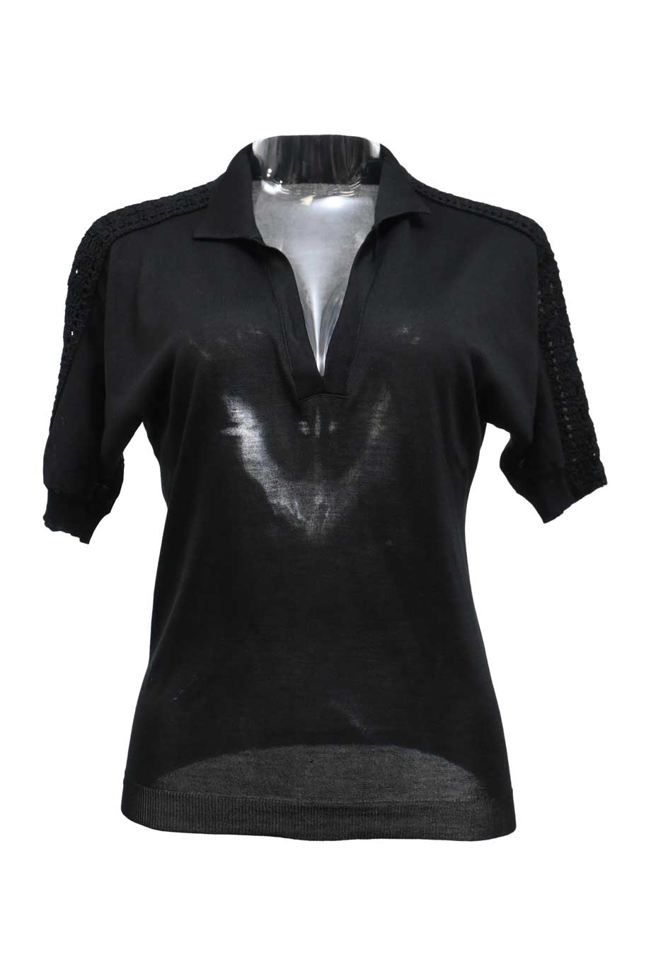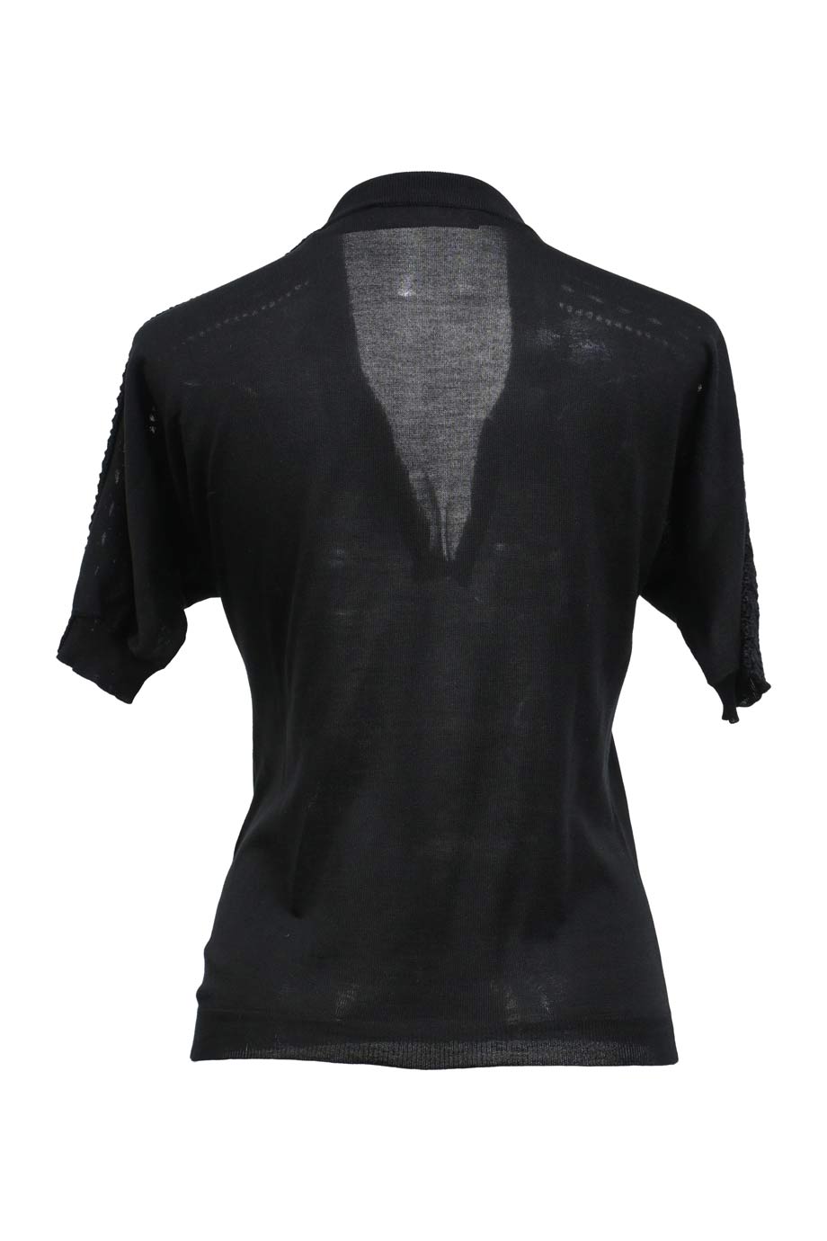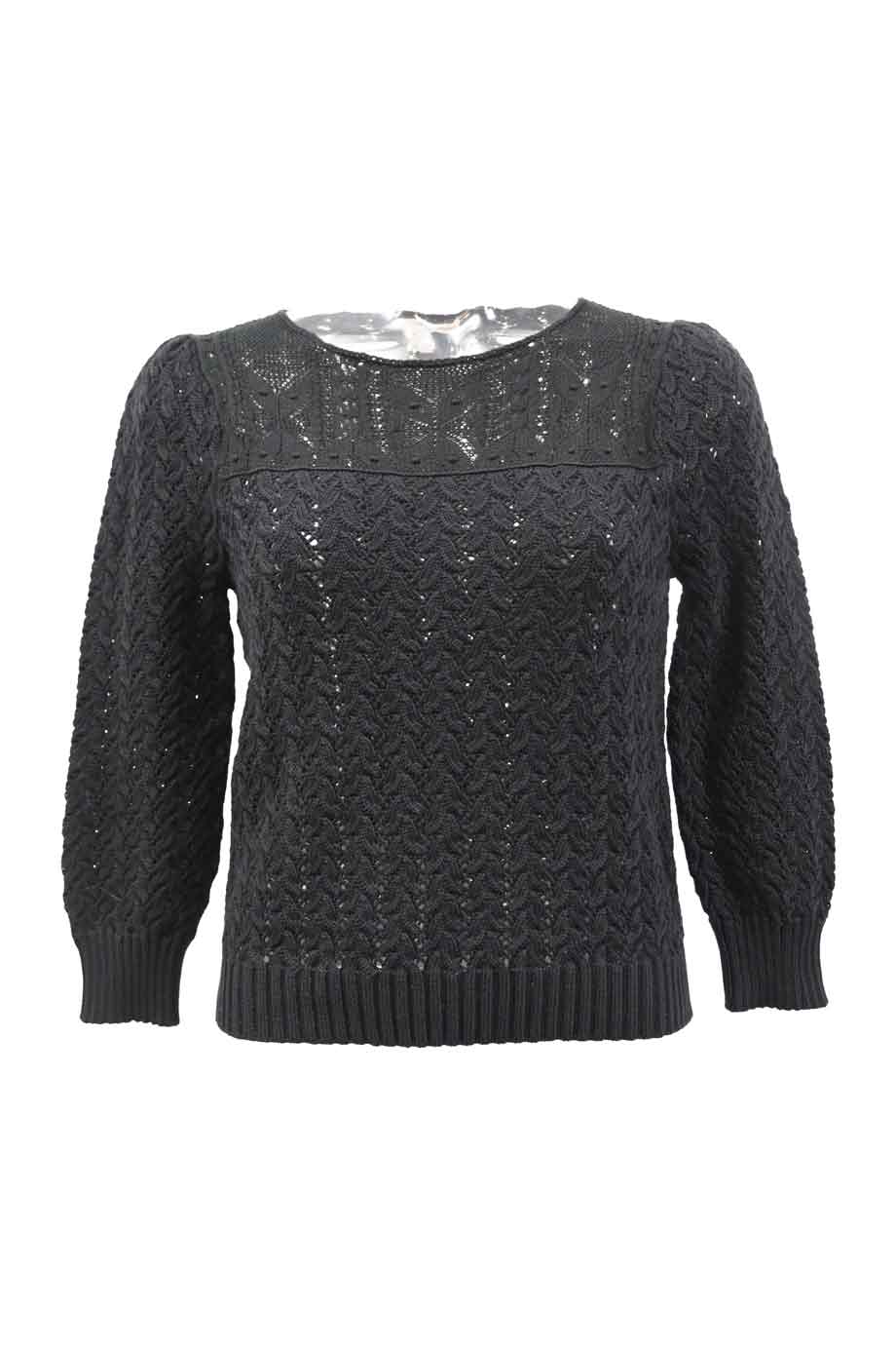 Black viscose-blend knit crewneck sweater with semi-sheer panelled sleeves