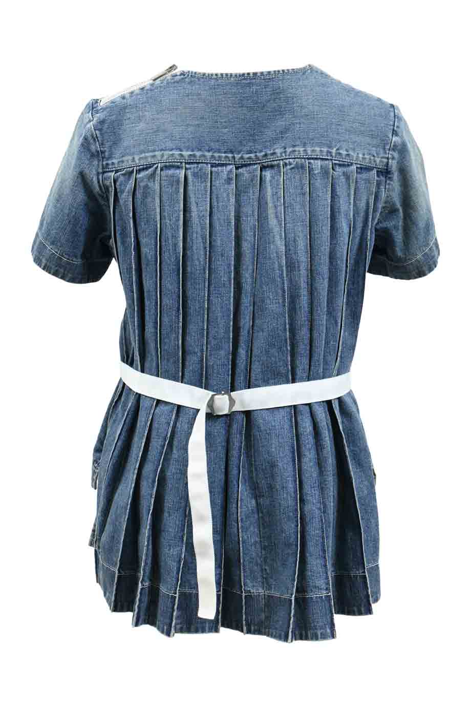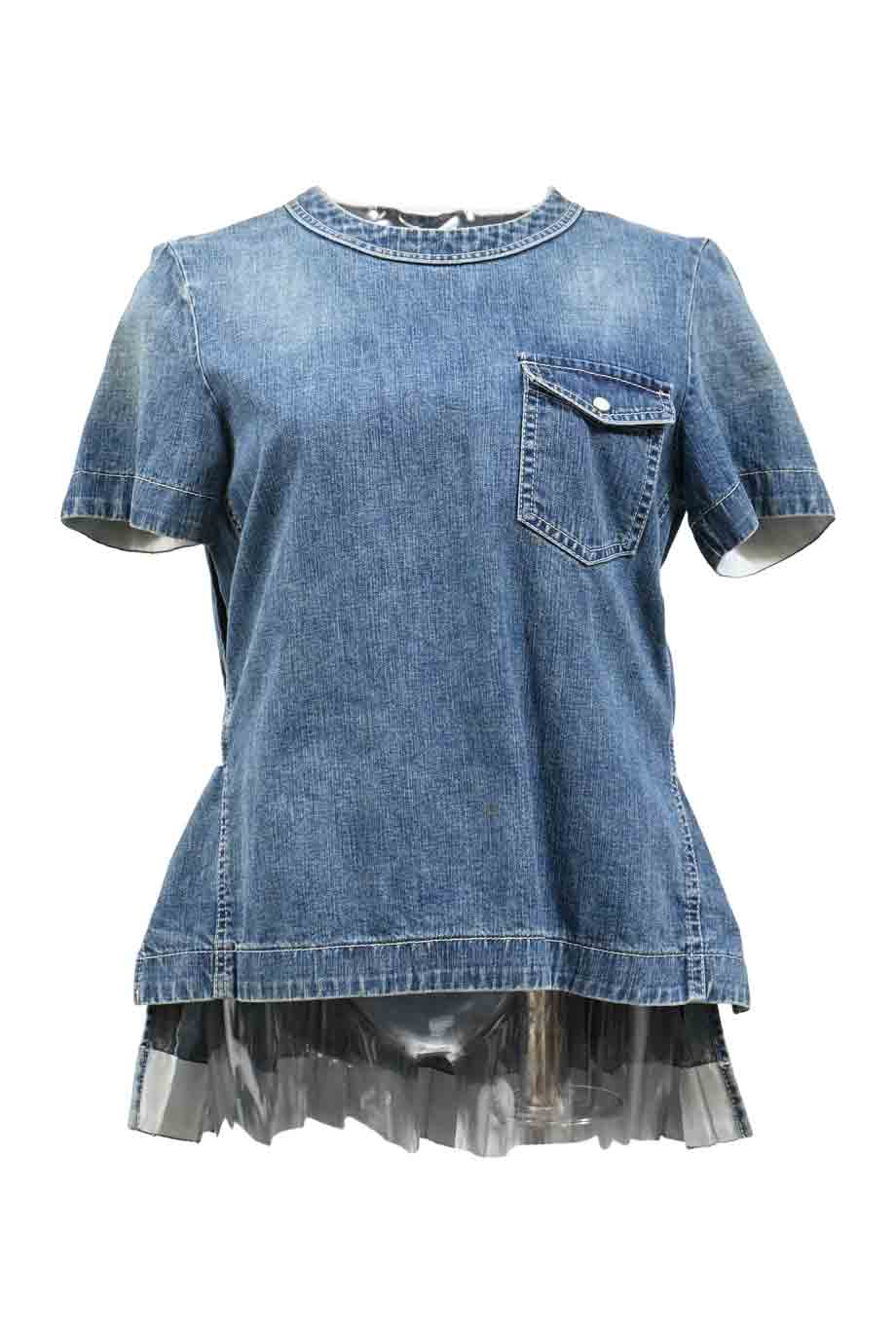 Washed indigo chambray snap-front short sleeve shirt with Western-style yoke and distressed edges