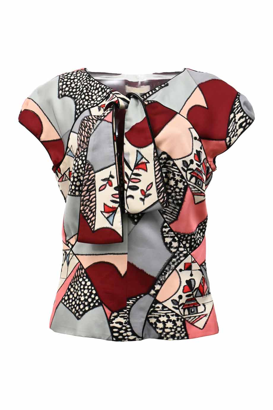 Red silk chainlink print pussy-bow blouse