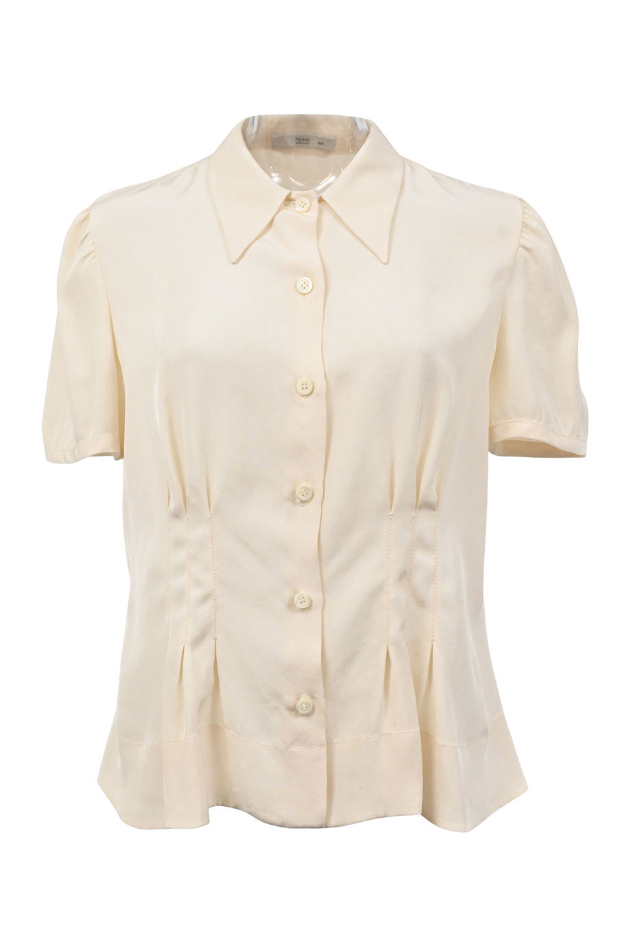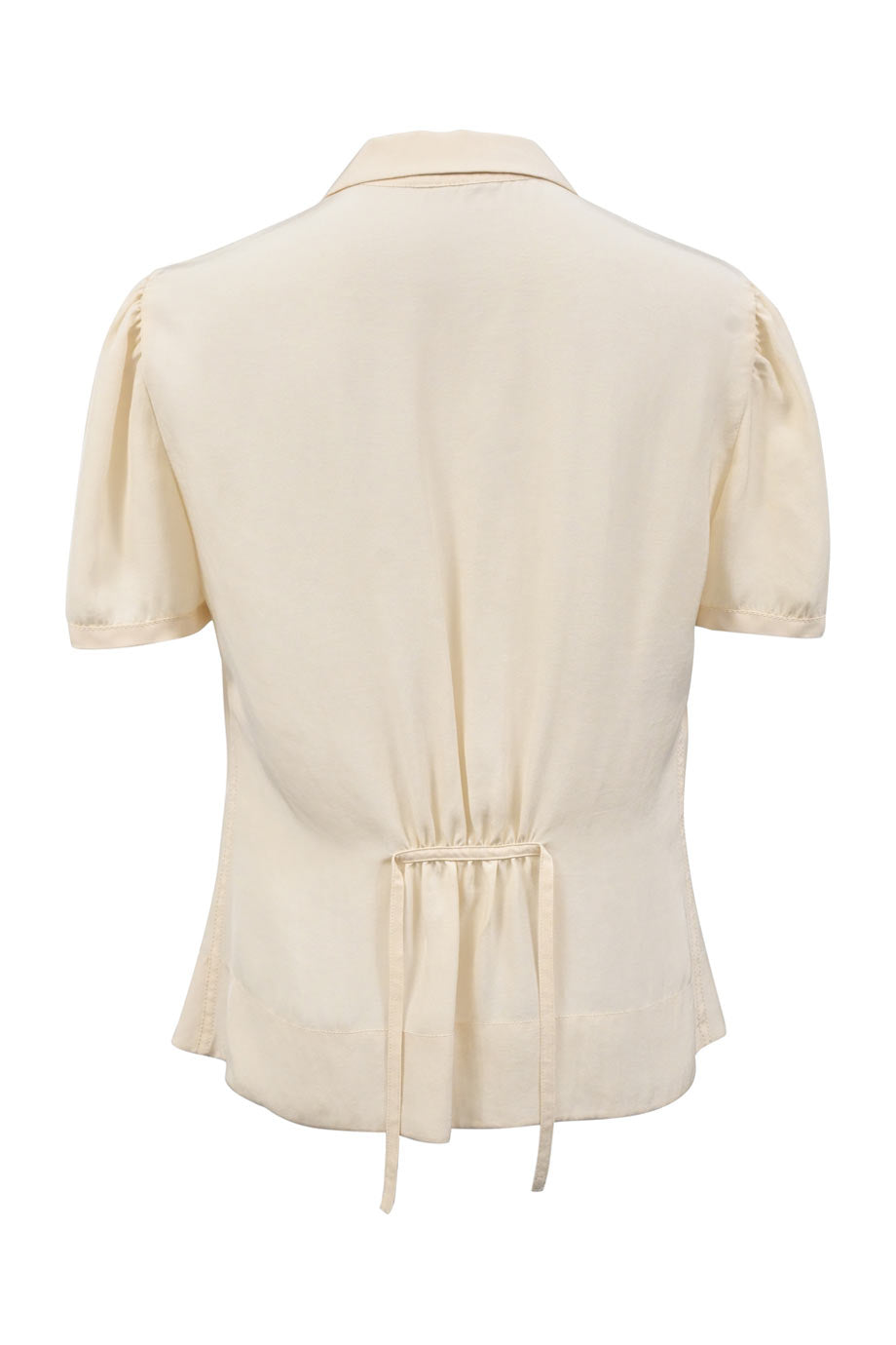 White poplin spread collar swing-style shirt with cropped bell sleeves and ruffle hem