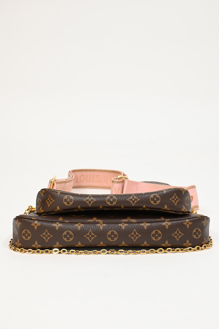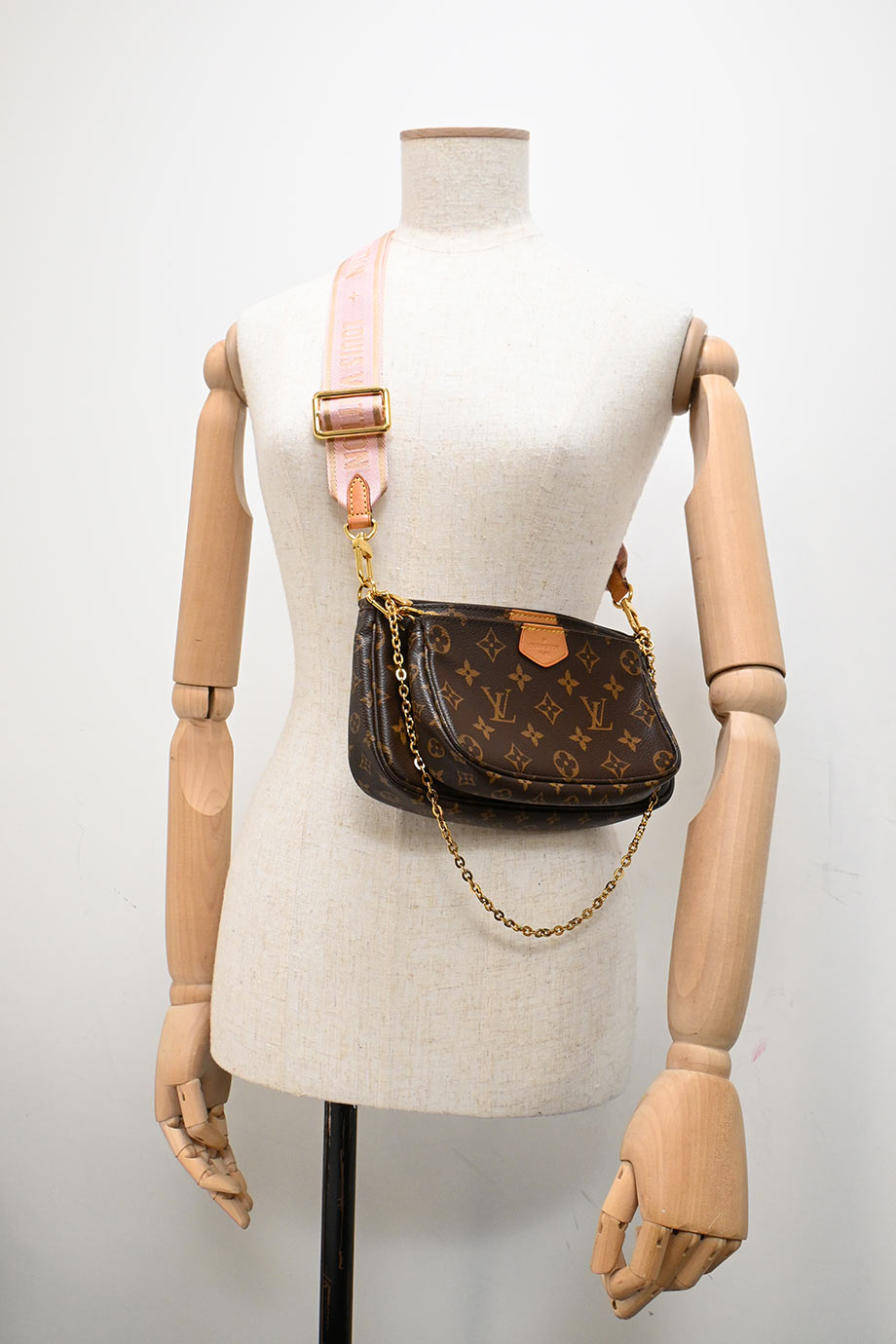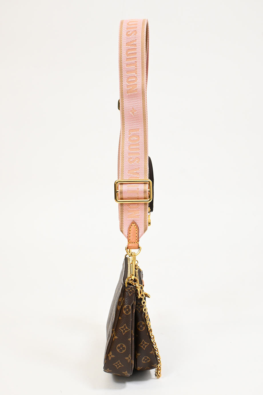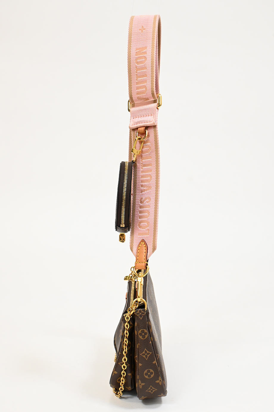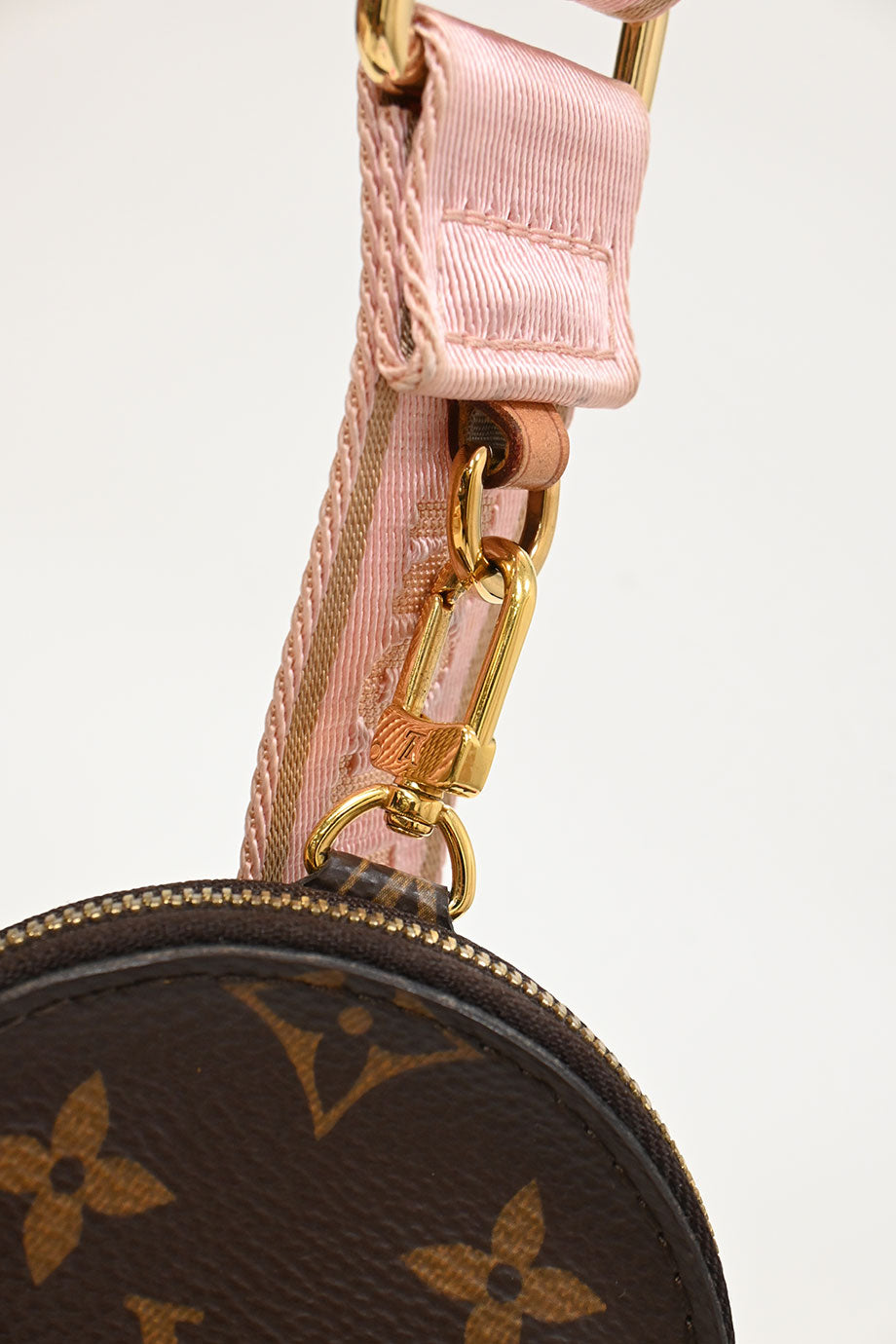 Detachable, adjustable rose pink logo shoulder strap with round coin purse and clasp.