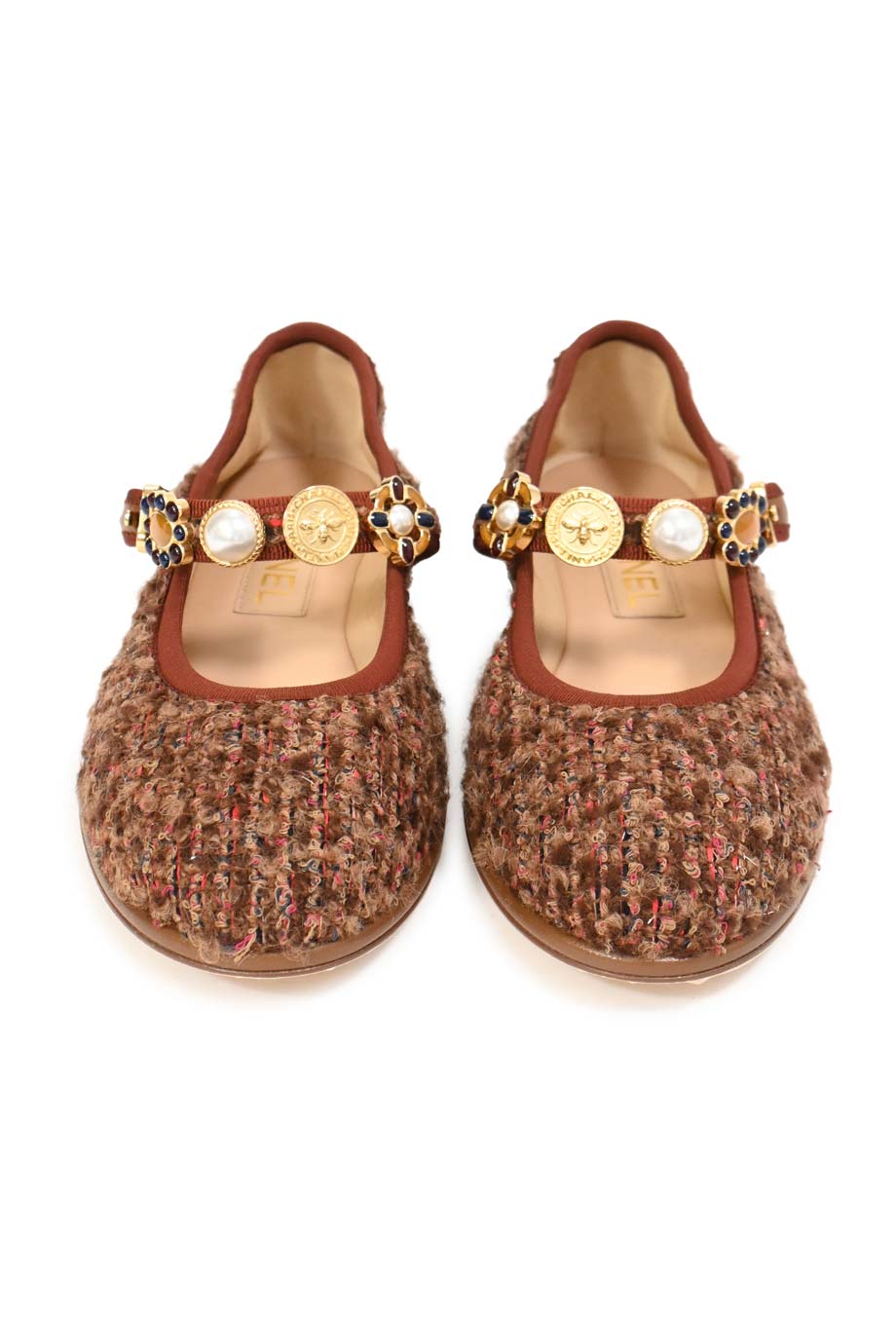 Camel suede round-toe Gommette ballerinas with tortoiseshell vamp buckle and textured rubber sole