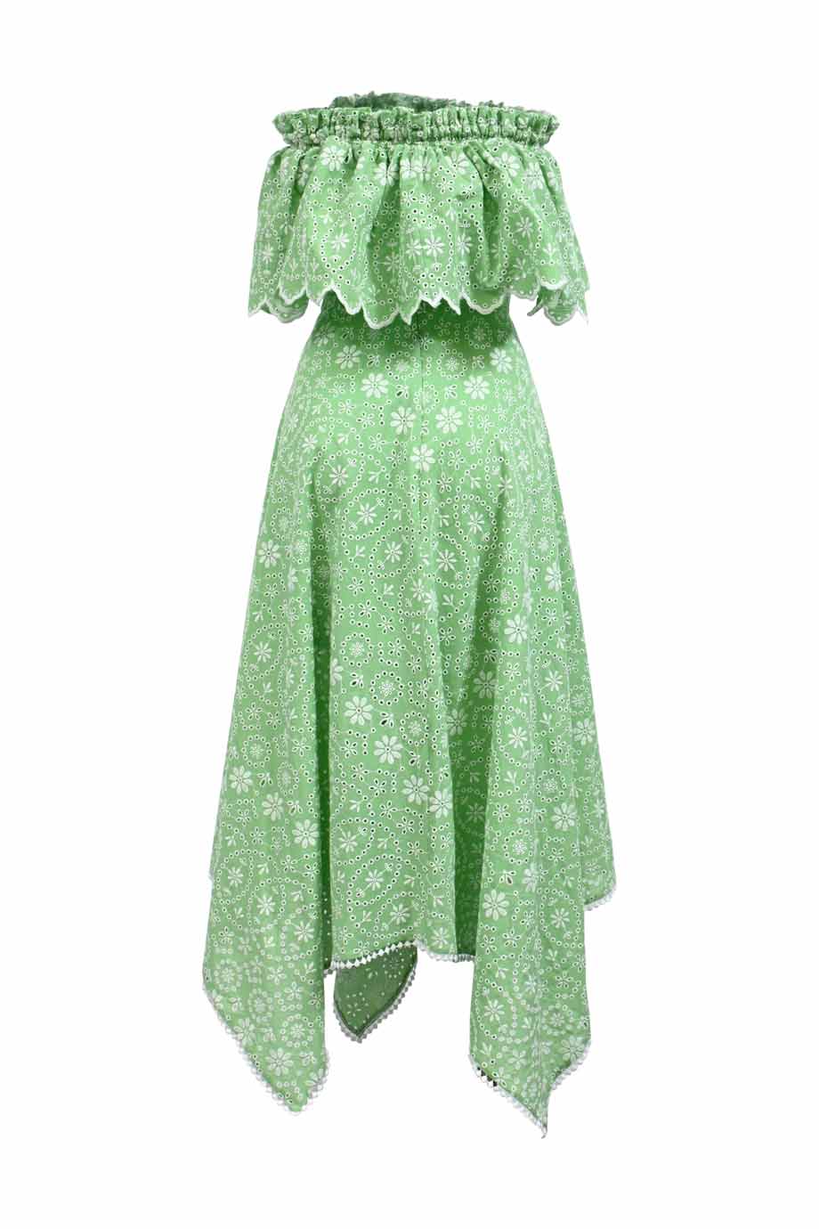 Green feather-trimmed cotton printed denim high-rise wide-leg pants with exposed zip fly