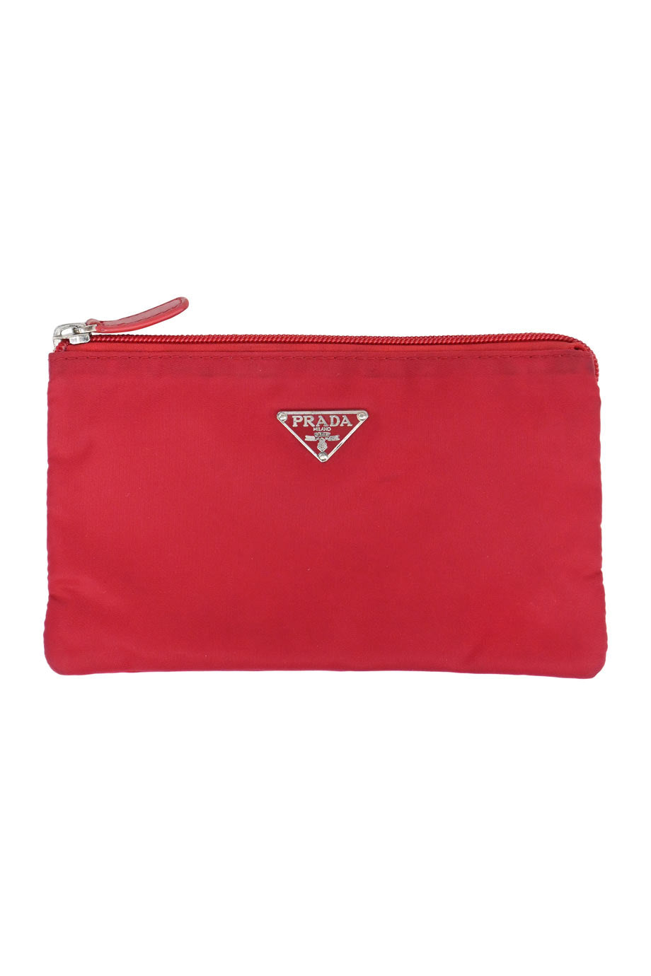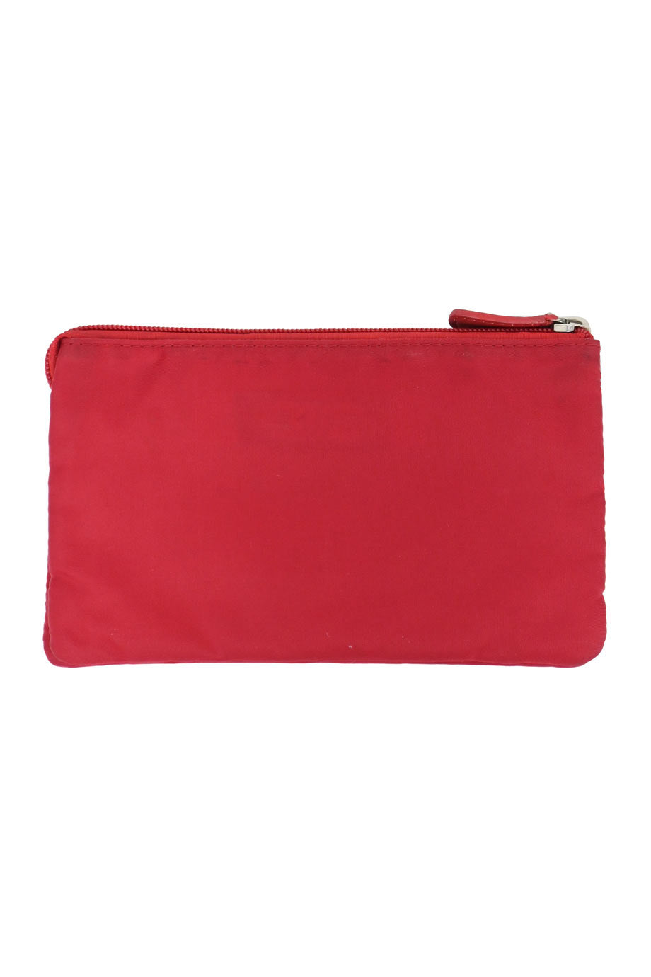 Red wool jersey knit V-neck shift dress with emblem patch pocket