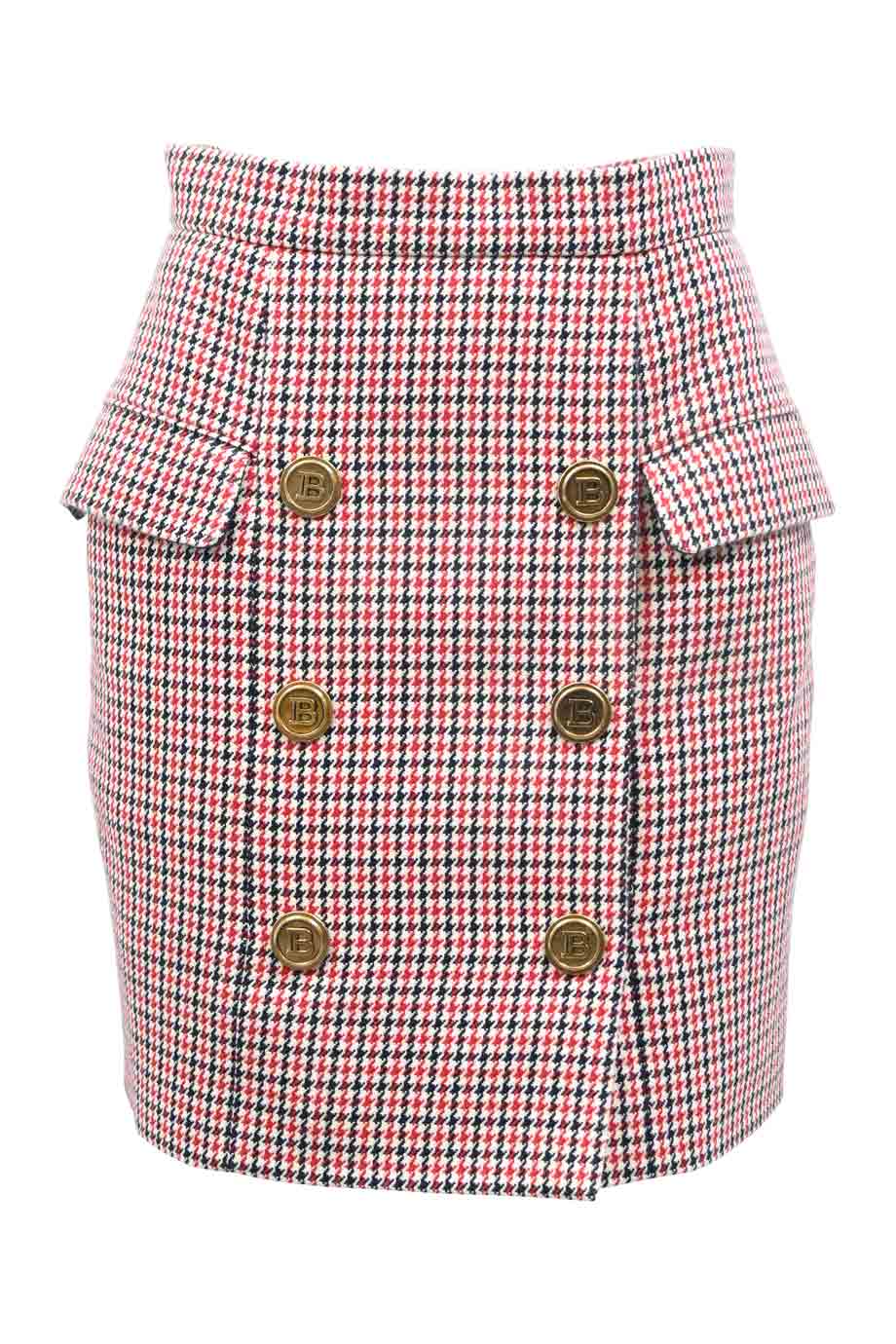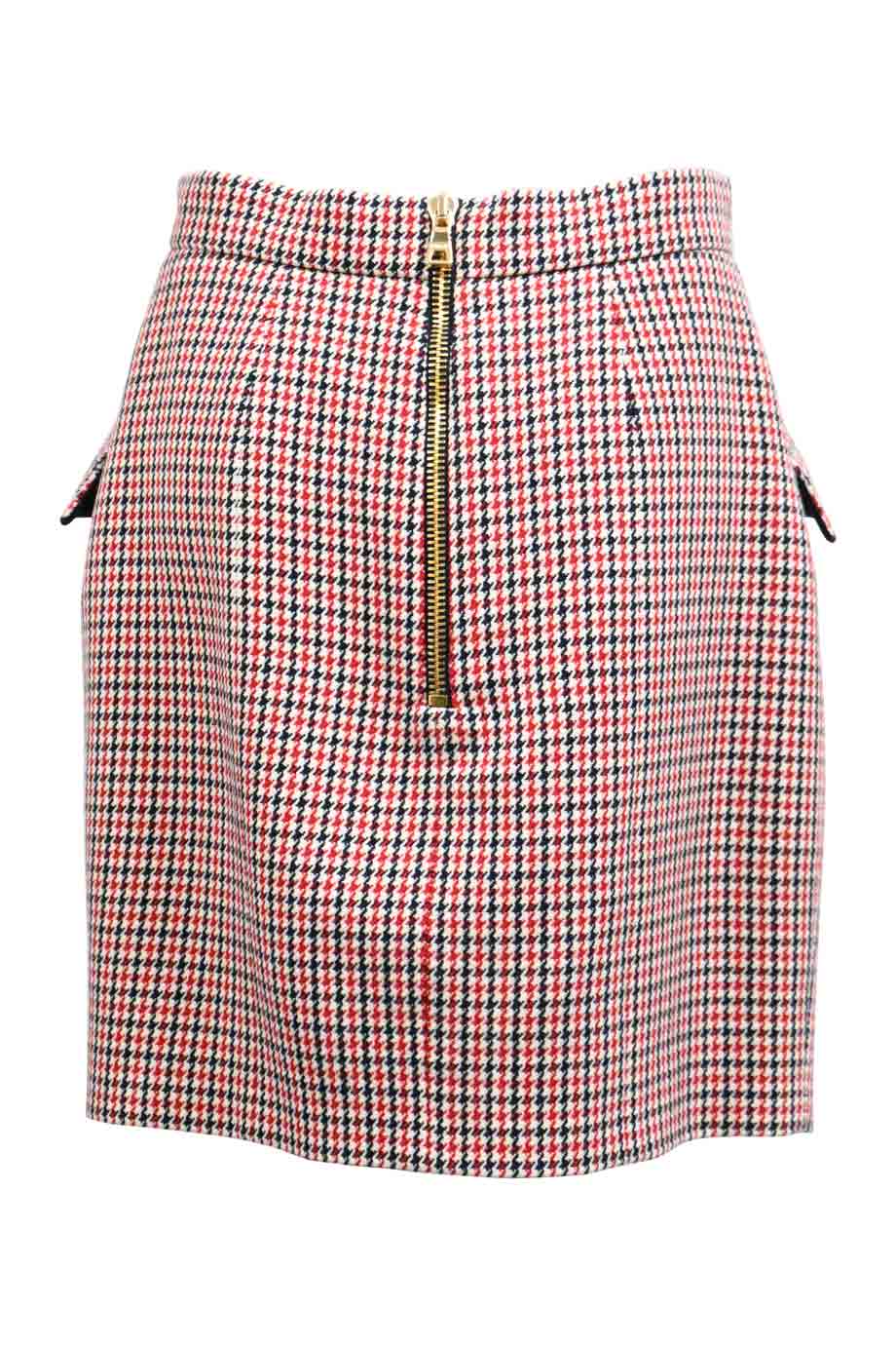 Red wool-silk blend Vichy check tweed single breasted square-neck bustle jacket