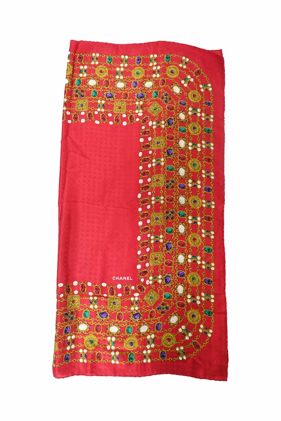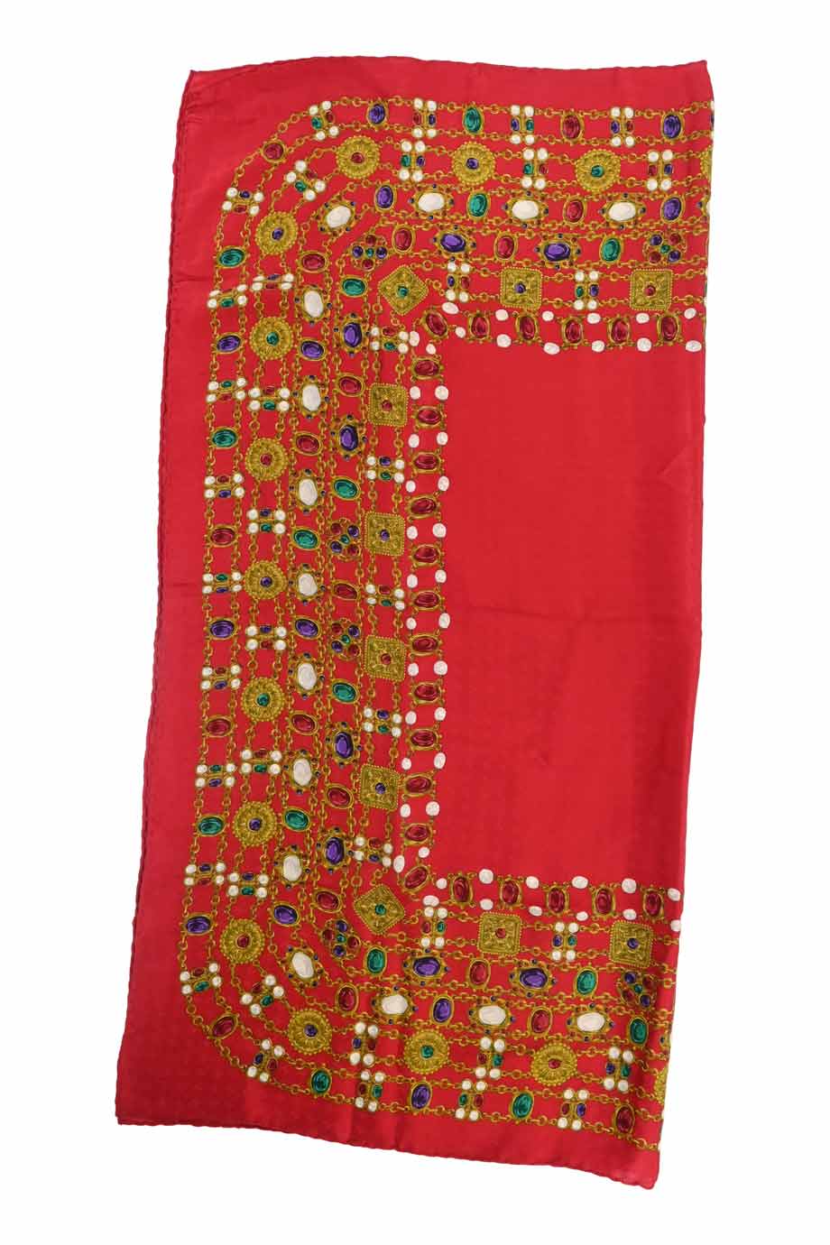 Red and fluo green silk scarf featuring 'Bride de Cour' motif by Françoise de la...