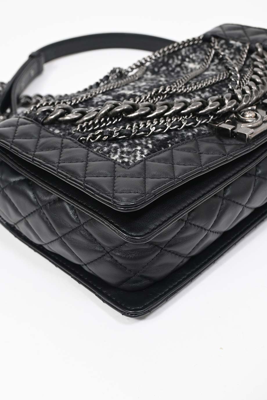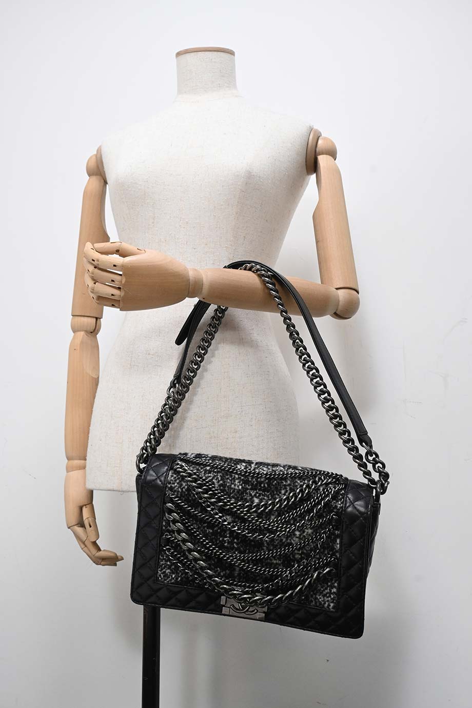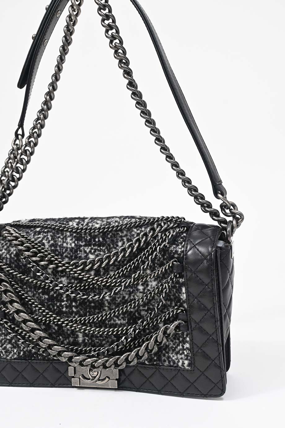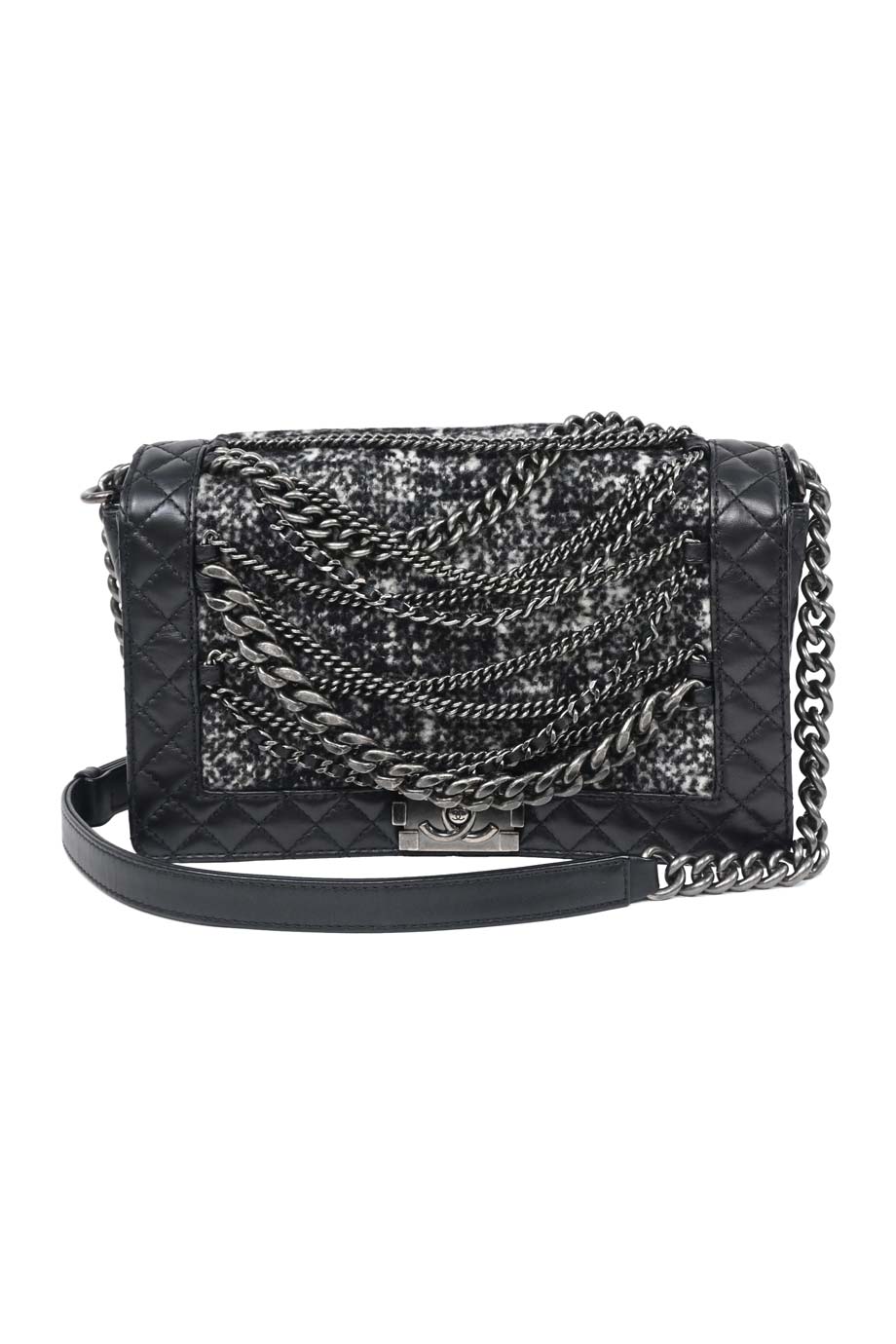 Adjustable sliding chain-link strap with leather shoulder pad.